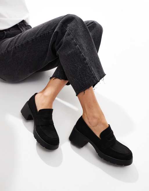 ASOS DESIGN Wide Fit – Scribble – Czarne loafersy z imitacji zamszu na grubej podeszwie i średnim obcasie