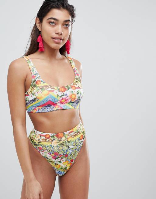 ASOS DESIGN – Wysoko wycięty dół od bikini z podwyższonym stanem w wyrazisty wzór mozaikowy