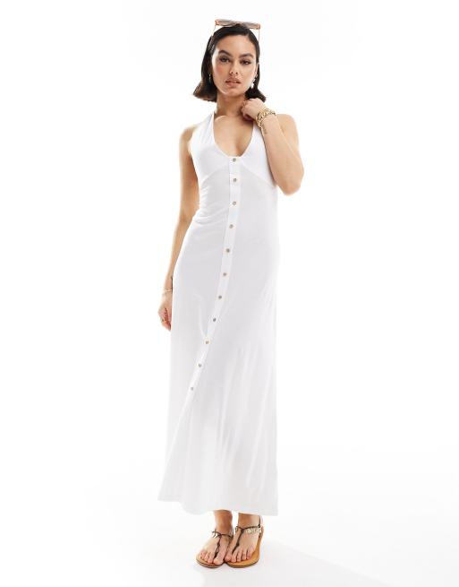 ASOS DESIGN – Zapinana na guziki biała sukienka midi z dekoltem typu halter