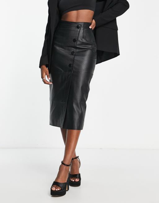 ASOS DESIGN – Zapinana na guziki czarna skórzana spódnica midi