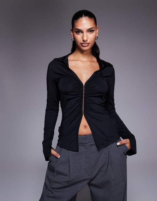 ASOS DESIGN – Zapinany na haftki dopasowany czarny top o wydłużonym fasonie