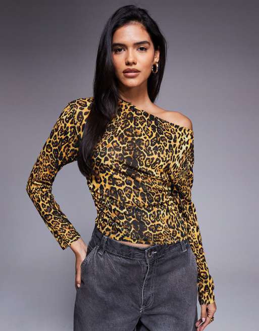 ASOS DESIGN – Zbierany w talii top z odsłoniętym ramieniem w kolorową panterkę