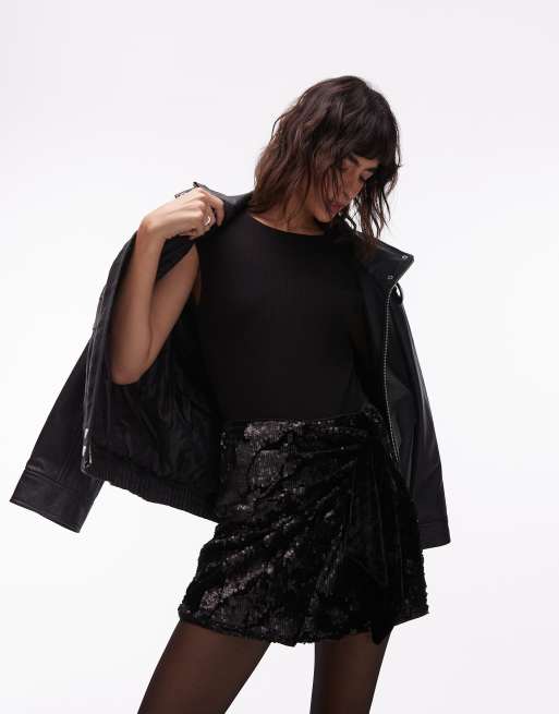 ASOS DESIGN – Zdobiona cekinami z kwiatowym wzorem czarna aksamitna spódnica mini z wiązaniem z boku