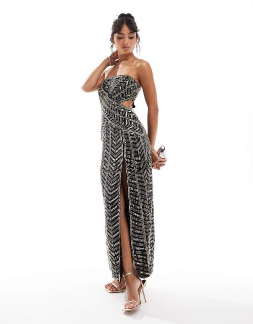 ASOS DESIGN – Zdobiona czarna sukienka midi z dekoltem bandeau i kopertową talią