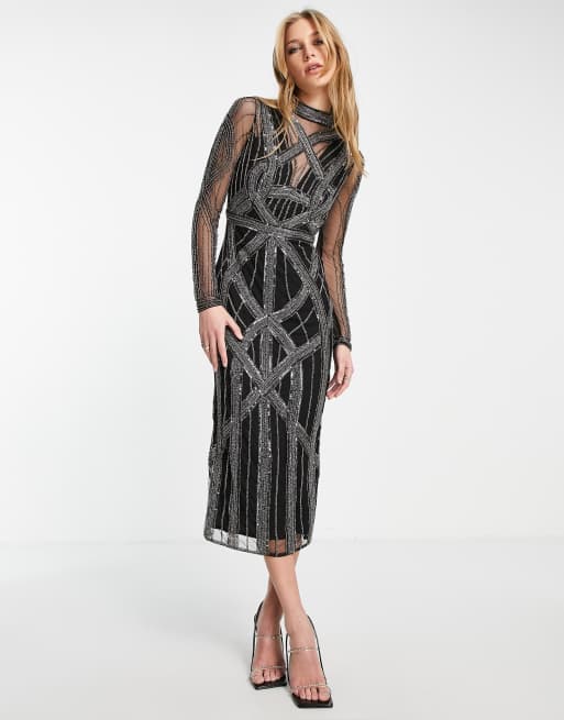 ASOS DESIGN – Zdobiona sukienka midi z długim rękawem i zabudowanym dekoltem
