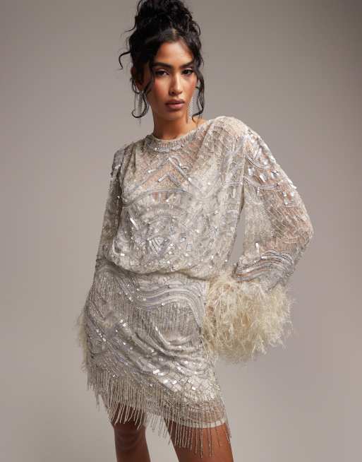 ASOS DESIGN – Zdobiona suknia ślubna mini z frędzlami przy mankietach w kolorze kości słoniowej