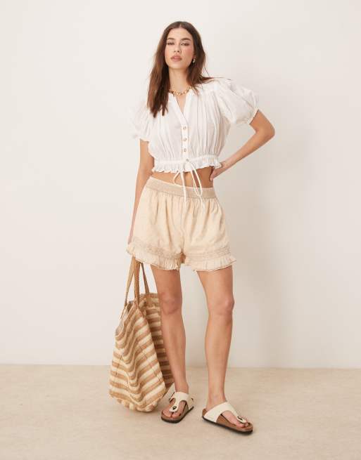 ASOS DESIGN – Zdobione koronką szorty z tkaniny dobby w neutralnym kolorze z efektem sprania