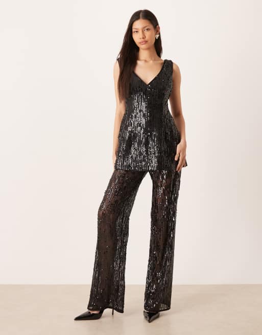 ASOS DESIGN – Zdobiony cekinami czarny prześwitujący zestaw z dopasowanym topem z baskinką i spodniami