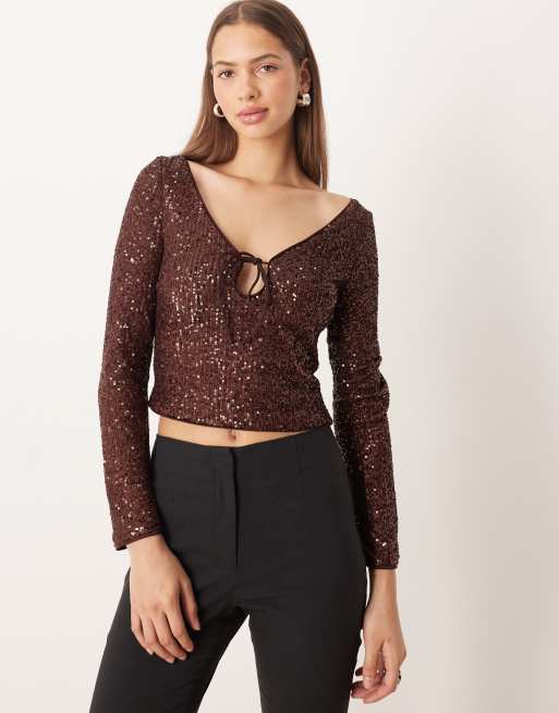 ASOS DESIGN – Zdobiony cekinami czekoladowy top z długimi rękawami i łezką