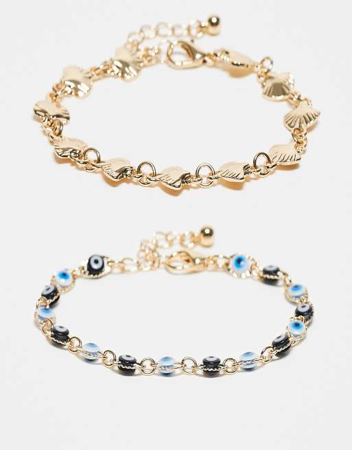 ASOS DESIGN – Zestaw 2 bransoletek w kolorze złota z muszelkami i oczkami