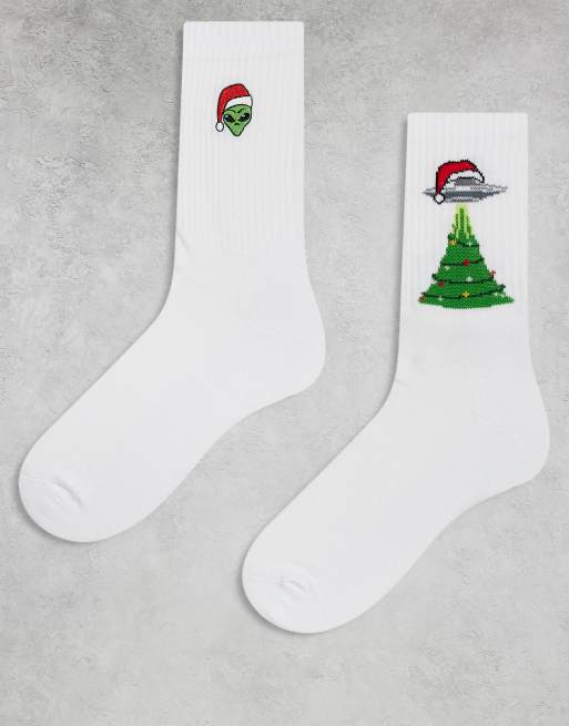 ASOS DESIGN – Zestaw 2 par białych skarpetek ze świątecznym i kosmicznym motywem
