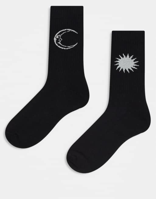 ASOS DESIGN – Zestaw 2 par czarnych skarpetek z haftowanym motywem księżyca i słońca