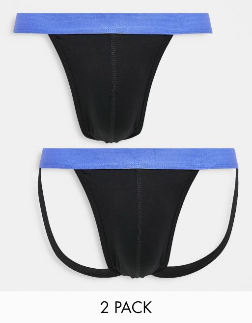 ASOS DESIGN – Zestaw 2 par czarnych slipów typu jock z kontrastową niebieską talią