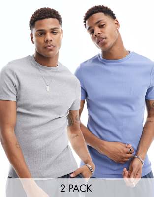 ASOS DESIGN – Zestaw 2 prążkowanych T-shirtów o kroju podkreślającym sylwetkę w kolorach szarym melanżowym i niebieskim