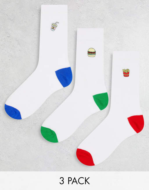 ASOS DESIGN – Zestaw 3 par białych skarpetek do kostki z grafiką z jedzeniem