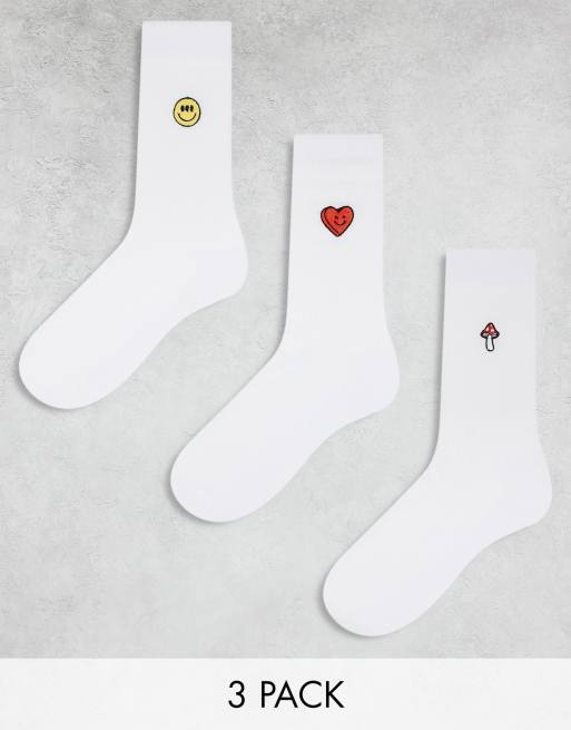 ASOS DESIGN – Zestaw 3 par białych skarpetek z wyhaftowanymi motywami grzyba, serca i uśmiechu