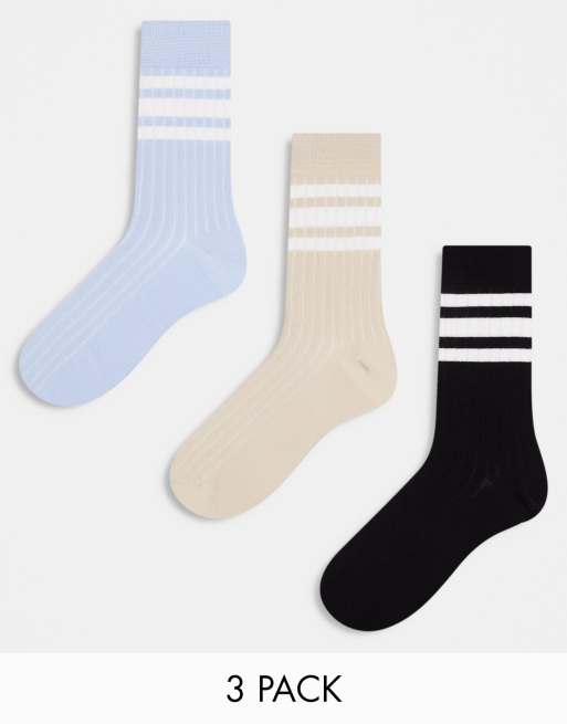 ASOS DESIGN – Zestaw 3 par prążkowanych skarpetek do kostki w paski w kolorze kamiennobeżowym/ niebieskim/ grafitowym