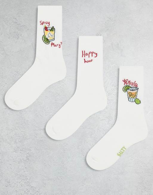 ASOS DESIGN – Zestaw 3 par skarpetek w kolorze ecru z haftowanym wzorem z drinkami