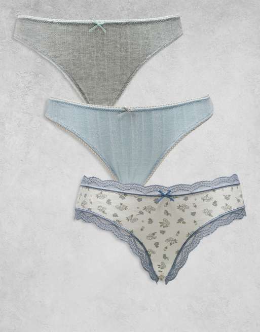 ASOS DESIGN – Zestaw 3 par stringów w drobny wzór w kolorach szarym i niebieskim z dzianiny pointelle