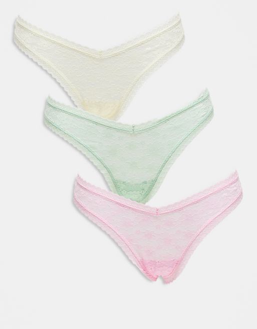 ASOS DESIGN – Zestaw 3 par stringów z koronki w pastelowych kolorach z obniżonym stanem
