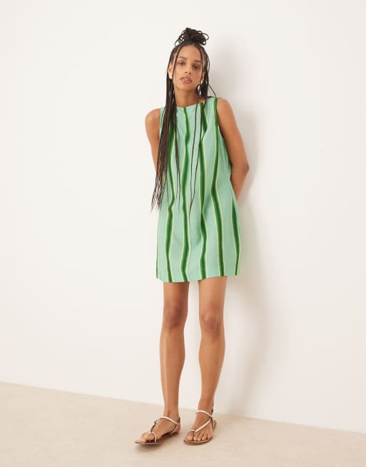ASOS DESIGN – Zielona bawełniano-lniana sukienka o prostym kroju mini z prostym dekoltem w paski