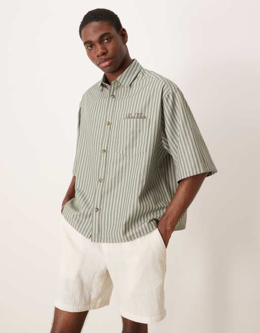 ASOS DESIGN – Zielona koszula o pudełkowym kroju w paski z haftem na piersi