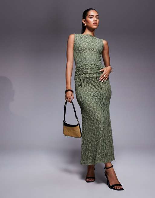 ASOS DESIGN – Zielona marszczona w talii koronkowa sukienka maxi