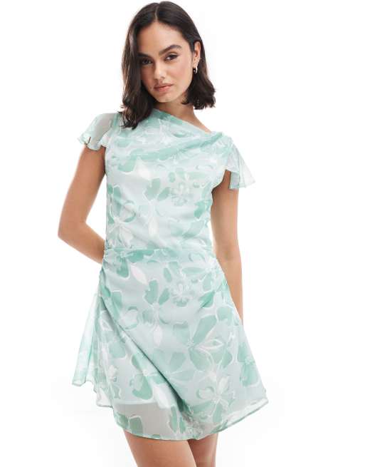 ASOS DESIGN – Zielona sukienka mini z asymetrycznym dekoltem w kwiatowy wzór