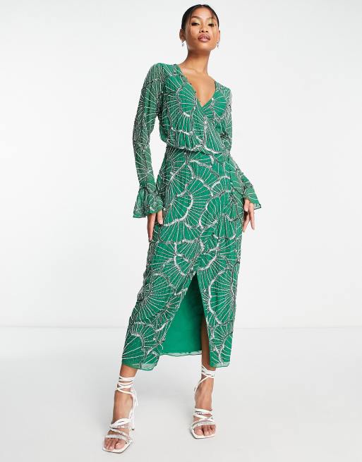 ASOS DESIGN – Zielona zdobiona sukienka kopertowa midi we wzór muszli