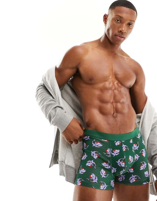 ASOS DESIGN – Zielone bokserki w świąteczny wzór w rekiny