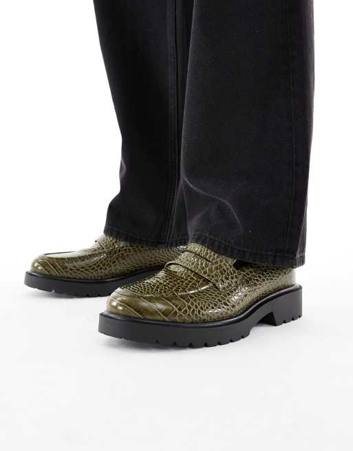 ASOS DESIGN – Zielone loafersy we wzór skóry krokodyla na podeszwie z bieżnikiem