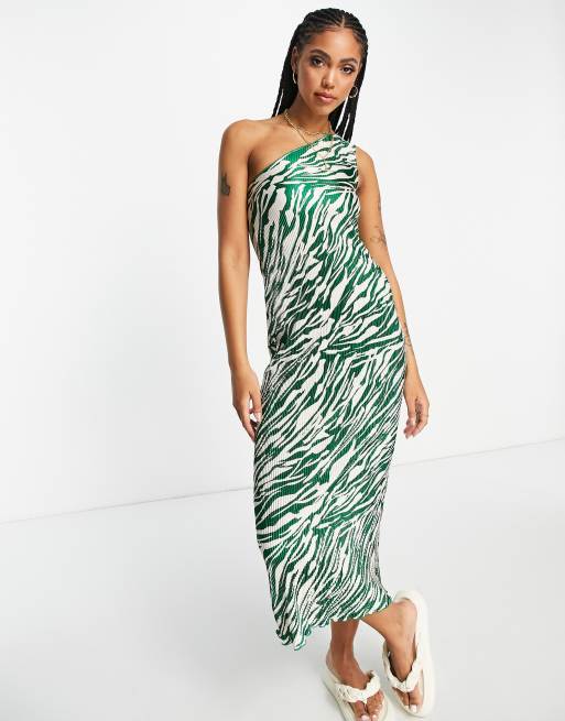 ASOS DESIGN – Zielono-kremowa plisowana sukienka midi na jedno ramię we wzór w paski zebry