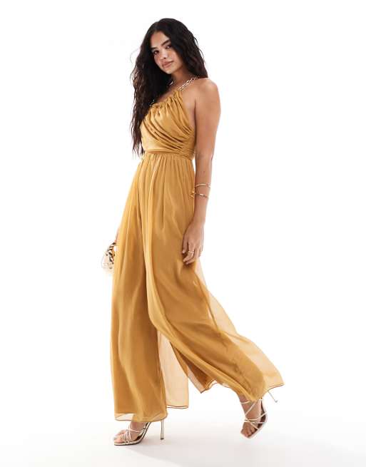 ASOS DESIGN – Zielonożółty kombinezon na jedno ramię z wycięciem i łańcuszkami