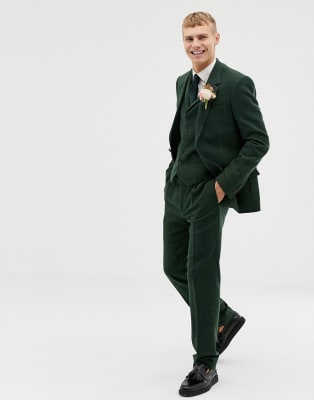 ASOS DESIGN – Zielony garnitur ślubny o dopasowanym kroju w jodełkę z domieszką wełny