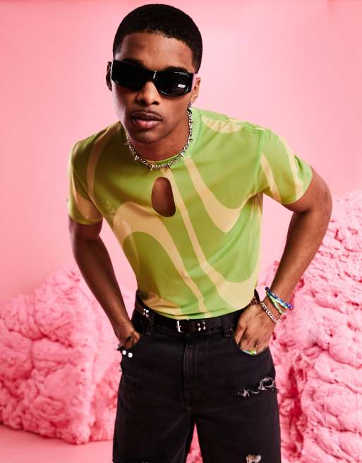 ASOS DESIGN – Zielony siateczkowy T-shirt o obcisłym kroju z siateczki ze wzorem i rozcięciem z przodu – LGREEN