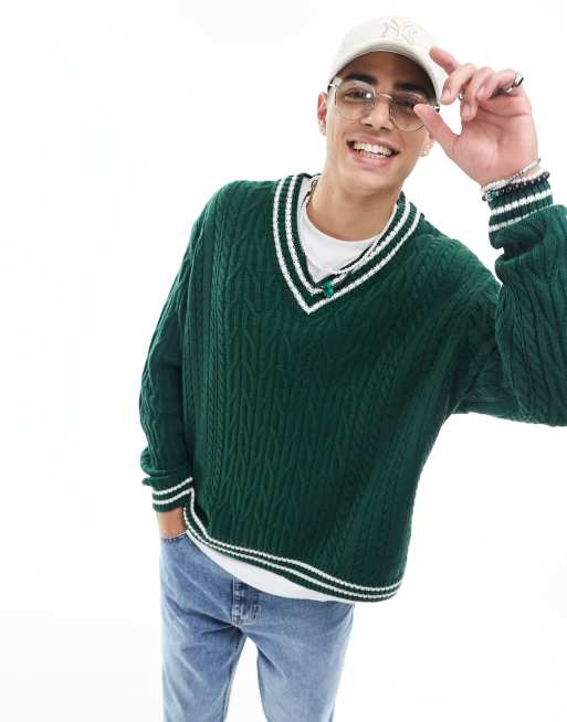 ASOS DESIGN – Zielony sweter oversize o warkoczowym splocie w krykietowym stylu z białymi lamówkami