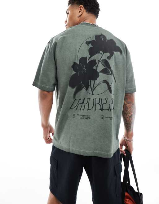 ASOS DESIGN – Zielony T-shirt oversize z nadrukiem kwiatów na plecach i efektem sprania