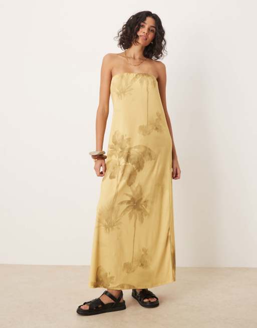 ASOS DESIGN – Żółta sukienka maxi z dekoltem bandeau we wzór w palmy