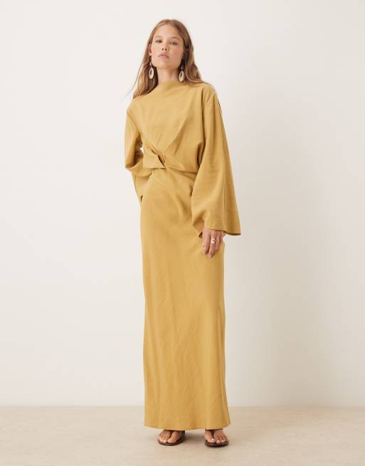 ASOS DESIGN – Złota sukienka maxi z długimi rękawami i zaszewkami w talii