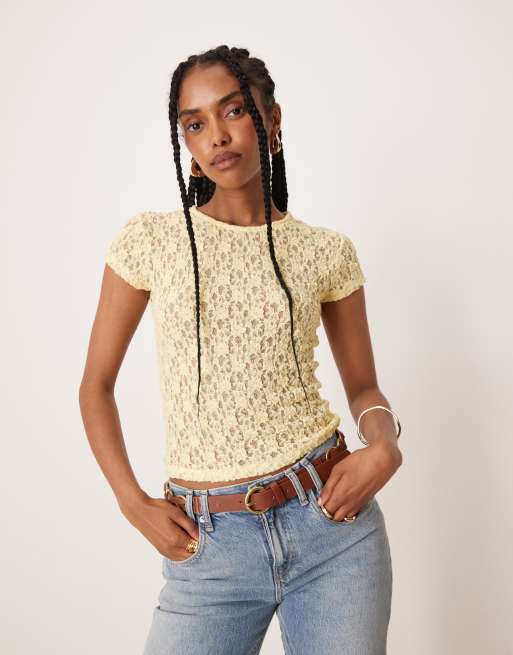 ASOS DESIGN – Żółty krótki i obcisły T-shirt z krótkimi rękawami z prześwitującej koronki