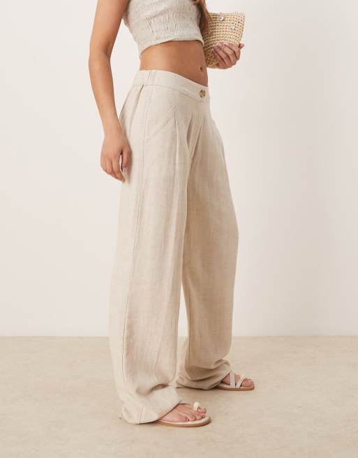 ASOS DESIGN – Zwężane lniane szarobeżowe spodnie z zakładkami z przodu