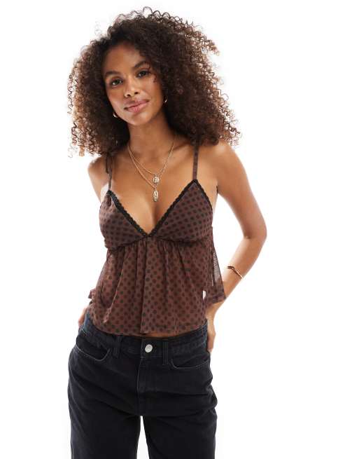 ASOS DESIGN – Zwiewny siateczkowy top na ramiączkach w brązowym kolorze w groszki