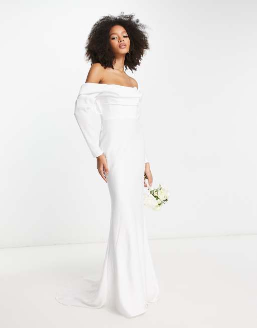 ASOS EDITION – Elodie – Satynowa drapowana sukienka ślubna z długimi rękawami i dekoltem bardot