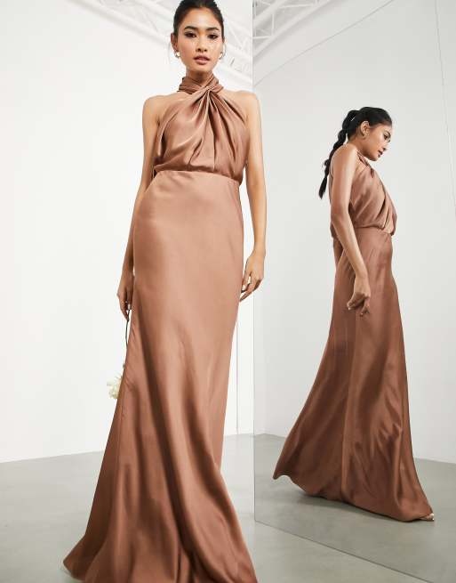 ASOS EDITION – Satynowa sukienka maxi z marszczonym dekoltem halter w kolorze mokka