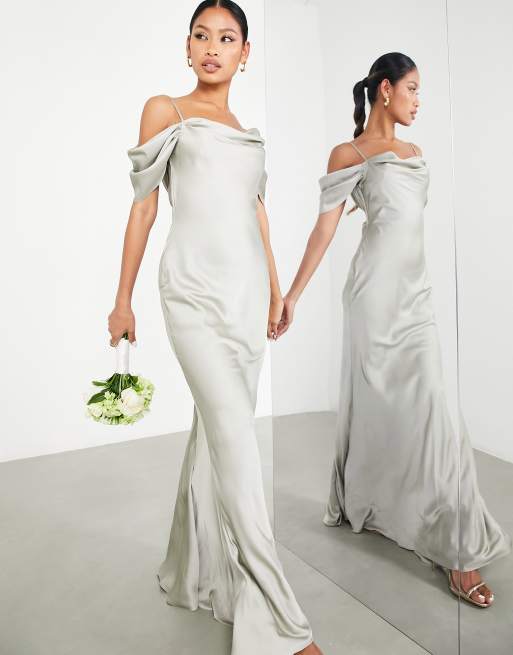 ASOS Edition – Szałwiowozielona satynowa sukienka maxi z odkrytymi ramionami