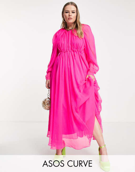 ASOS EDITION Curve – Jaskraworóżowa sukienka midi z ozdobnym marszczeniem