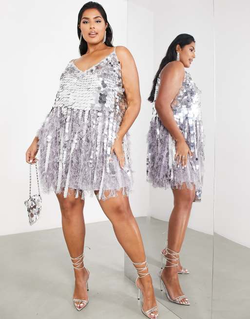 ASOS EDITION Curve – Srebrno-liliowa sukienka cekinowa mini obszyta sztucznymi piórkami