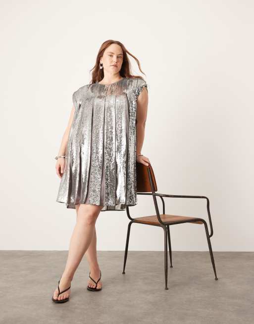 ASOS Edition Curve – Szara plisowana sukienka trapezowa mini zdobiona cekinami na całej powierzchni