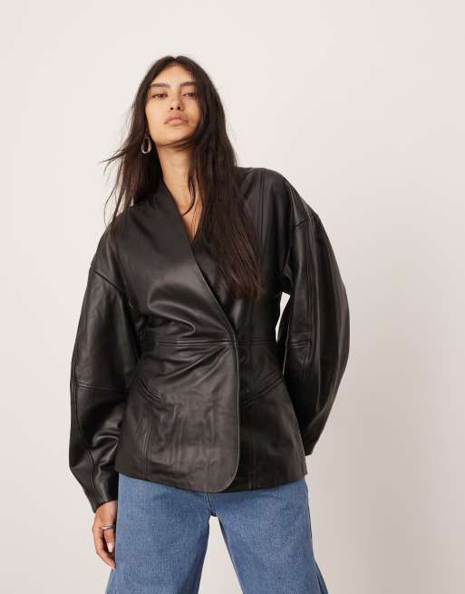 ASOS Edition – Czarna skórzana kurtka z balonowymi rękawami i wcięciem w talii