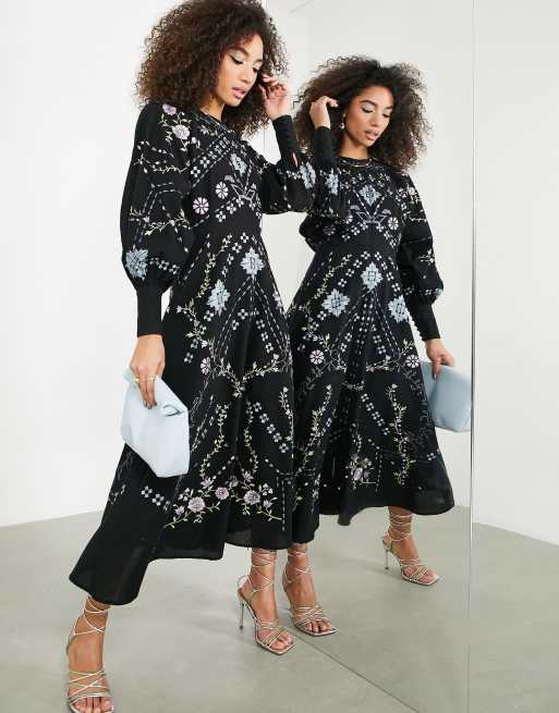 ASOS Edition – Czarna taliowana sukienka midi w haftowany geometryczny kwiatowy wzór